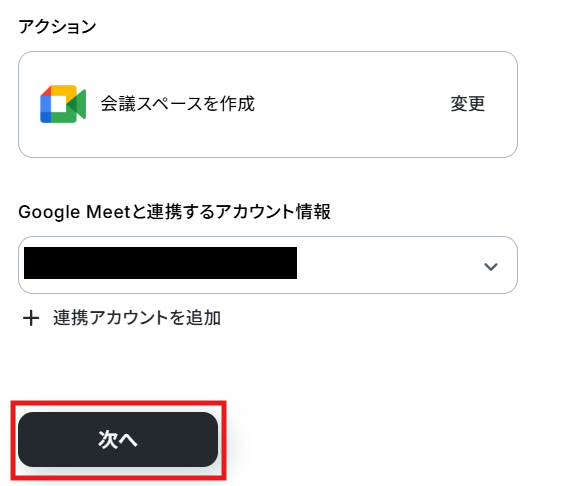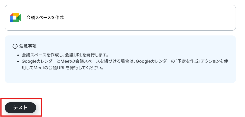 ステップ4:Google Meetのアクション設定 次に、Google Meetで会議スペースを作成する設定を行います。 「会議スペースを作成」をクリックしてください。