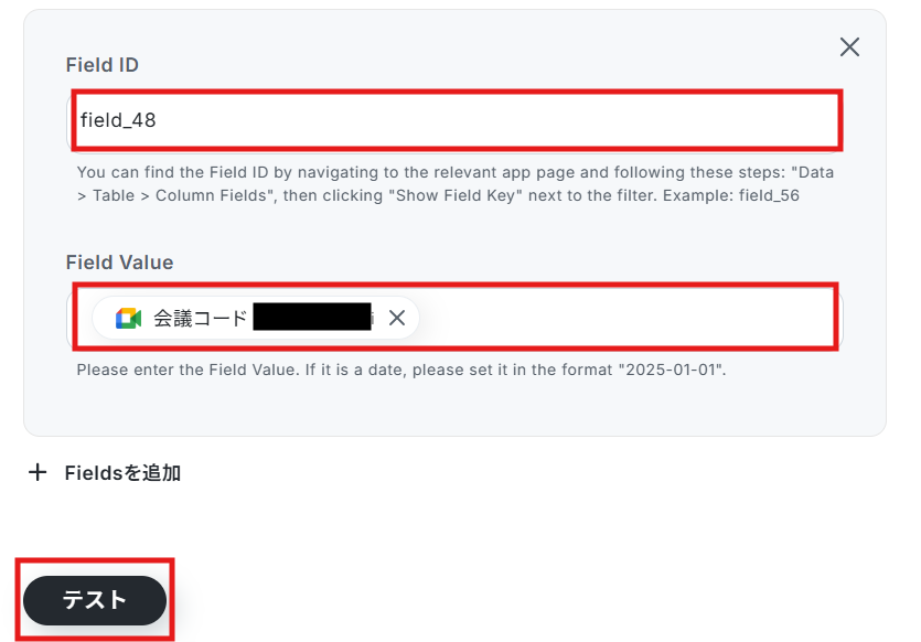 更新したいフィールドのField ID・Field Valueが設定できたら、「テスト」を実行してください。