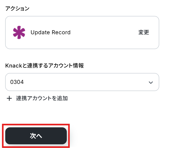 こちらも、ステップ1でマイアプリ連携したKnackのアカウント情報が自動で表示されます。 アクションは、「Update Record」」のままで次に進みましょう!