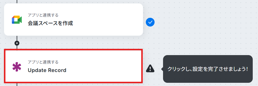 ステップ5:Knackのアクション設定 最後に、Google Meetで作成した会議スペースの情報をもとに、Knackのレコードを更新する設定を行います。 「Update Record」をクリックしてください。