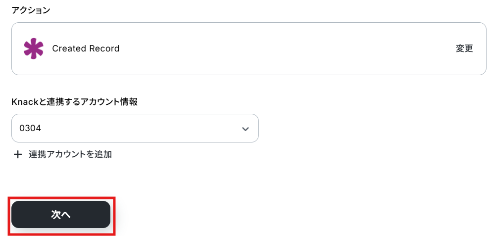 クリックすると以下の画面に移ります。 アカウント情報と書かれた項目にはステップ1でマイアプリ連携した際の情報が記載されています。 アクションは、「Created Record」のままで次に進みましょう!