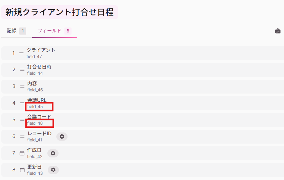 まず更新対象のField IDを確認しましょう。 Field IDはKnackで、「Object>システムフィールドを表示>フィールド」から確認できます。 今回レコードを更新したい「会議URLフィールド」はField_45、「会議コードフィールド」はField_48と確認できました。