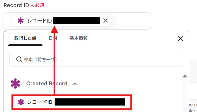 編集欄をクリックして、「Created Record」から「レコードID」を選択してください。 ※デフォルトで入力されている「←トリガーで取得した値を設定してください」は、削除しておきましょう。