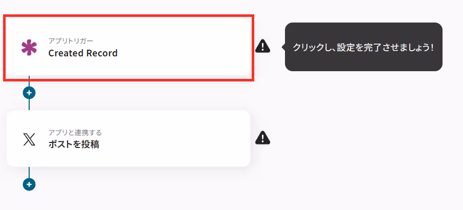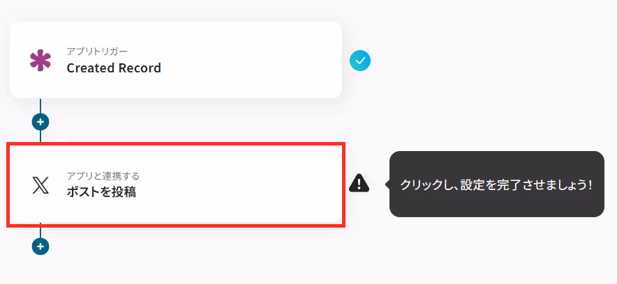 Knackに新しくレコードが追加されたことをYoomで検知したら、その情報をもとにX(Twitter)にポストを新規投稿する設定をしていきます。