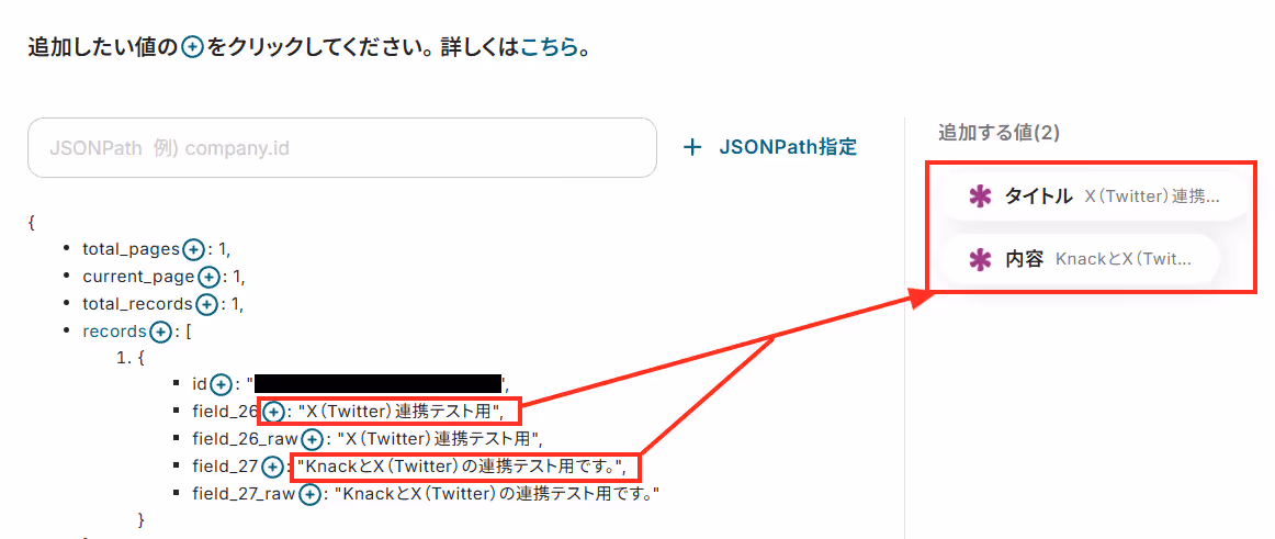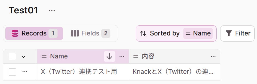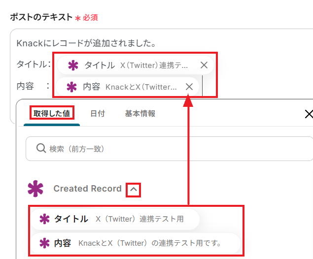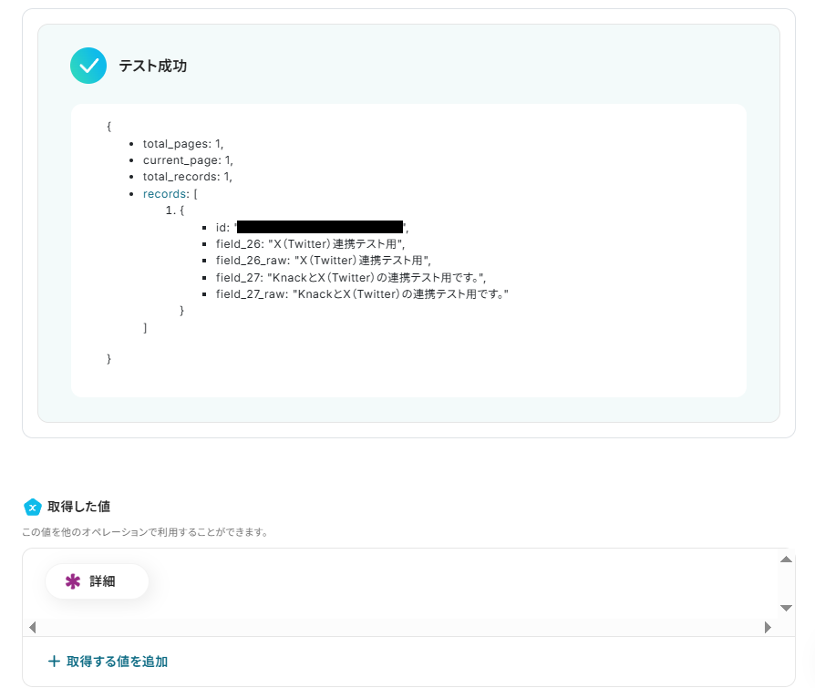 ここではテストとしてX(Twitter)に新規投稿することを踏まえて、Knackのレコードから詳細な情報も取得しておきましょう。