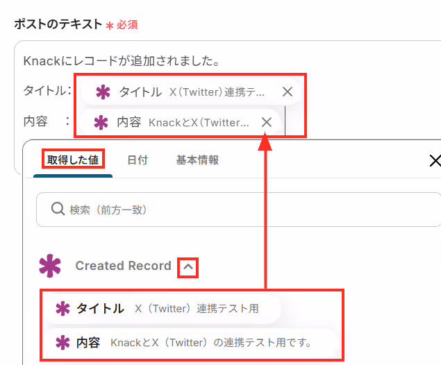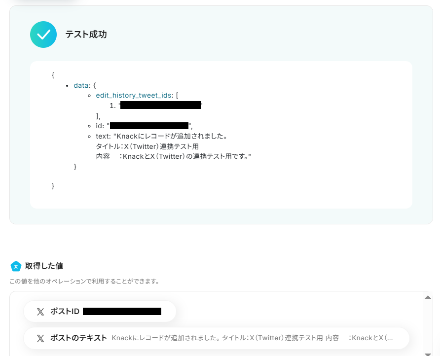 ちなみにここで取得した値を活用することにより、今後新たにKnackでレコードが追加されると、新しい内容が反映されて、X(Twitter)に自動投稿されていきます。