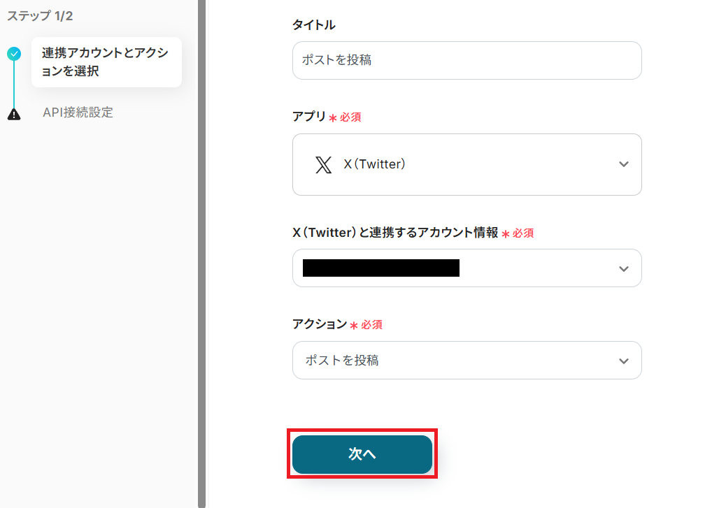 タイトルを任意で設定し、X(Twitter)と連携するアカウントやアクション内容を確認したら「次へ」を押してください。