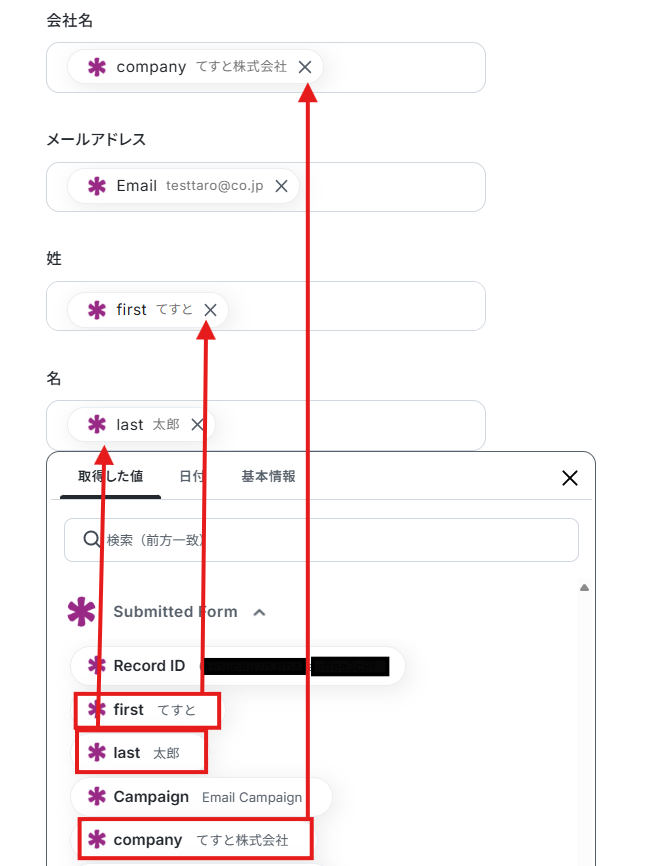 Knackのアクションで取得した値を活用して各項目を設定していきます。