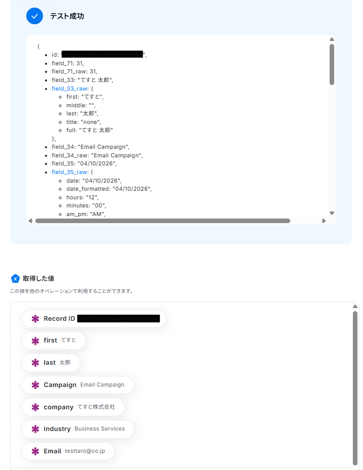 - AirtableのアウトプットはJSONPathから取得可能です。取得方法は「『取得する値』を追加する方法」をご参照ください。