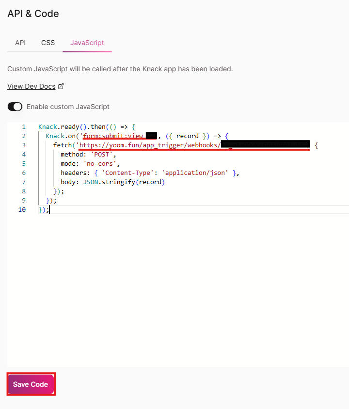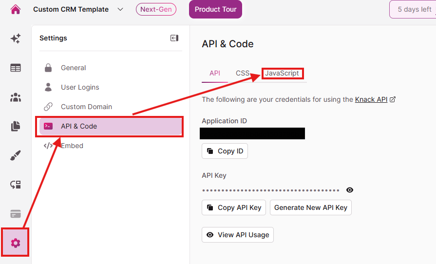 Knackにログインしたら、設定から「API&Code」→「JavaScript」を選択します。