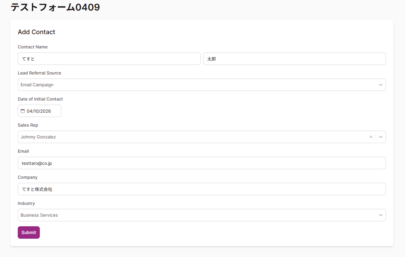 今回は実際にKnackのフォームから以下のようにテスト送信を行いました。