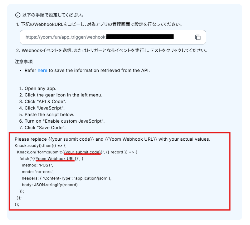 {{Yoom Webhook URL}}の部分を先ほどコピーしたWebhookURLに置換していきます。