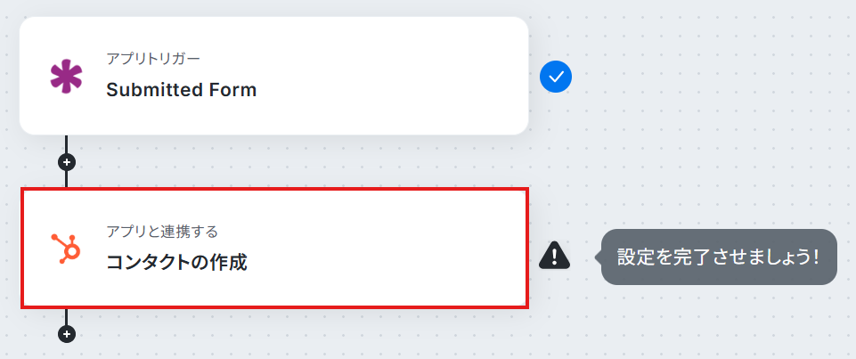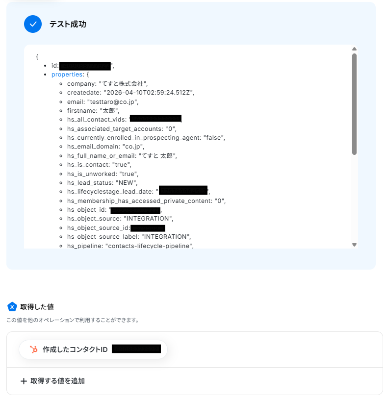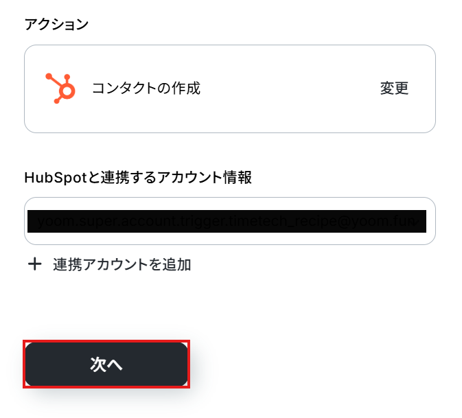 次にHubSpotでコンタクトを作成するアクションを設定していきます。