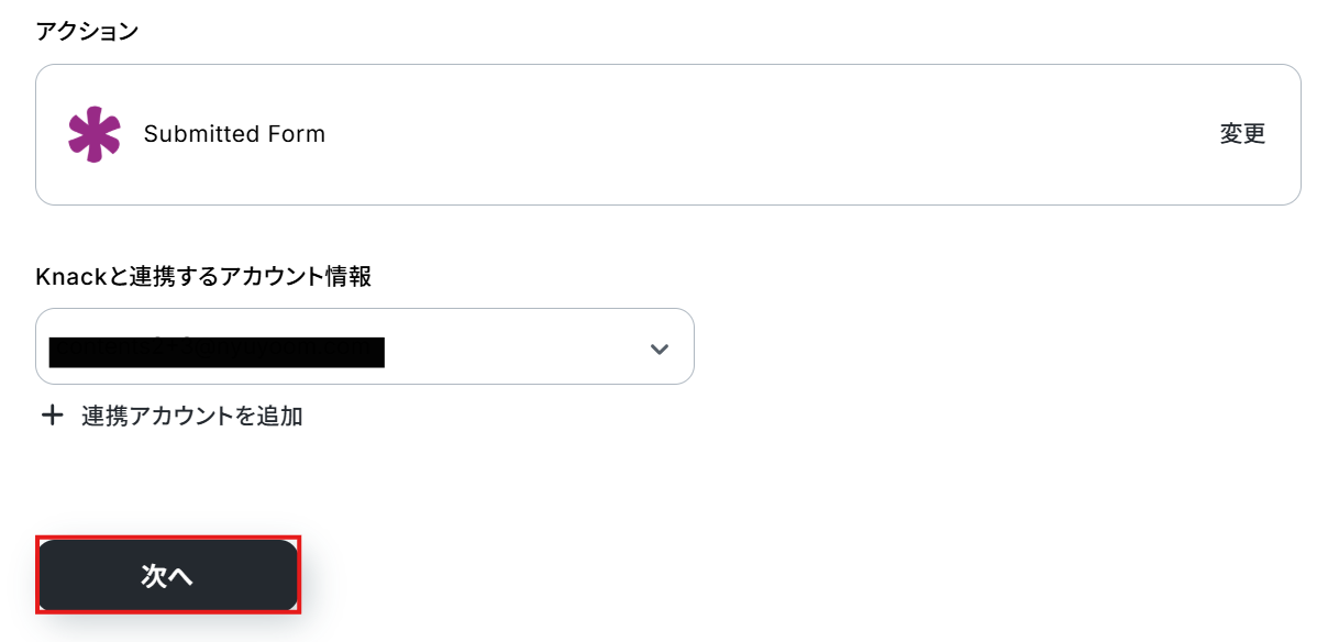 - 次に、トリガーでKnackを選択し、「フォームが提出されたら(Submitted Form)」というアクションを設定します。
