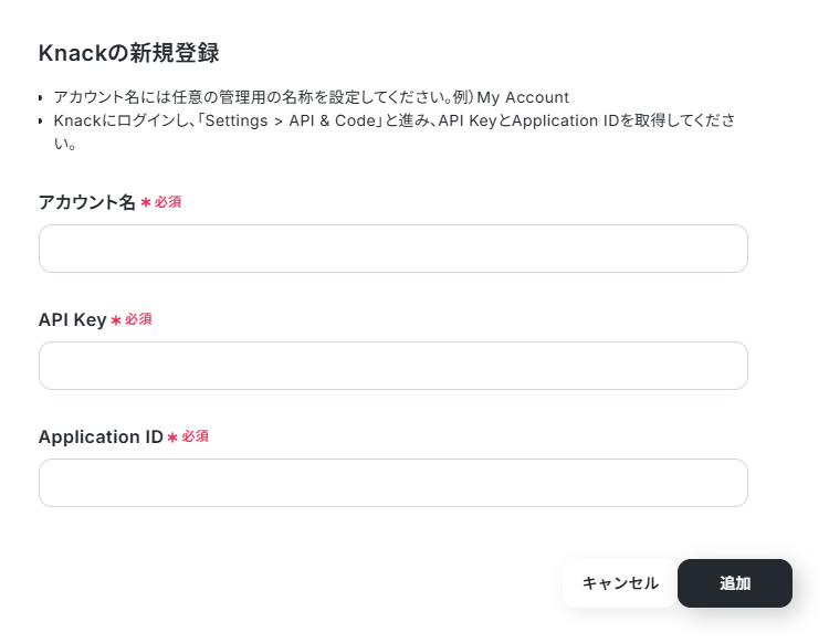 Knackの設定画面から、「API&Code」→「API」と進み、Application IDとAPI KeyをコピーしてYoomの画面に戻り、貼り付け、「追加」をクリックしてください。