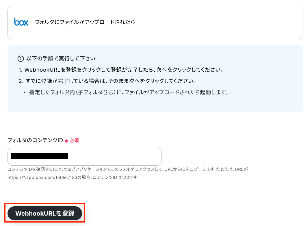 続いて、「フォルダのコンテンツID」 を設定します。 入力欄下の注釈を参照して設定し、「WebhookURLを登録」をクリックしてください。 すでにWebhookが登録されているとエラーになるため、このタイミングで新規フォルダを作成することをおすすめします。 ※エラーが表示される方は以下のリンクをご確認ください。