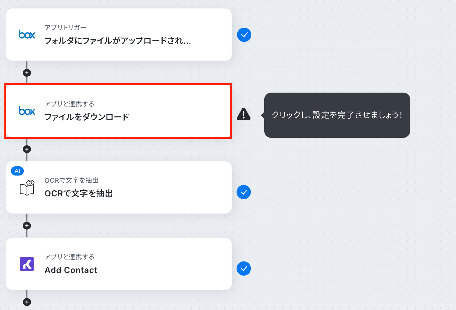 はじめに、BoxとKommoをYoomと連携します。 次に、トリガーでBoxを選択し、「フォルダにファイルがアップロードされたら」というアクションを設定します。 続いて、オペレーションでBoxの「ファイルをダウンロード」アクションを設定し、アップロードされたファイルを取得します。 次に、OCR機能の「任意の画像やPDFを読み取る」を設定し、ダウンロードしたファイルから必要な情報を抽出します。 最後に、オペレーションでKommoの「Add Contact」を設定し、抽出した情報をもとにコンタクトを追加します。 ※「トリガー」:フロー起動のきっかけとなるアクション、「オペレーション」:トリガー起動後、フロー内で処理を行うアクション ■このワークフローのカスタムポイント