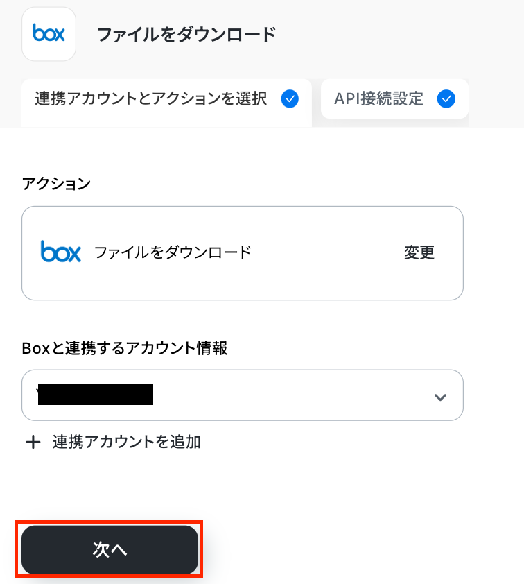 アクションはそのままで、連携するアカウント情報を確認します。 「次へ」をクリックしましょう!