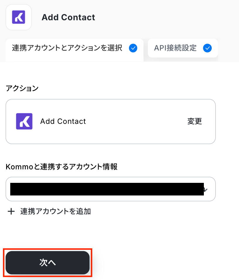 ステップ6:Kommoのアクション設定 最後の設定です!ここでは、OCRした内容でKommoにContactを追加する設定を行います。 赤枠部分をクリックしましょう!