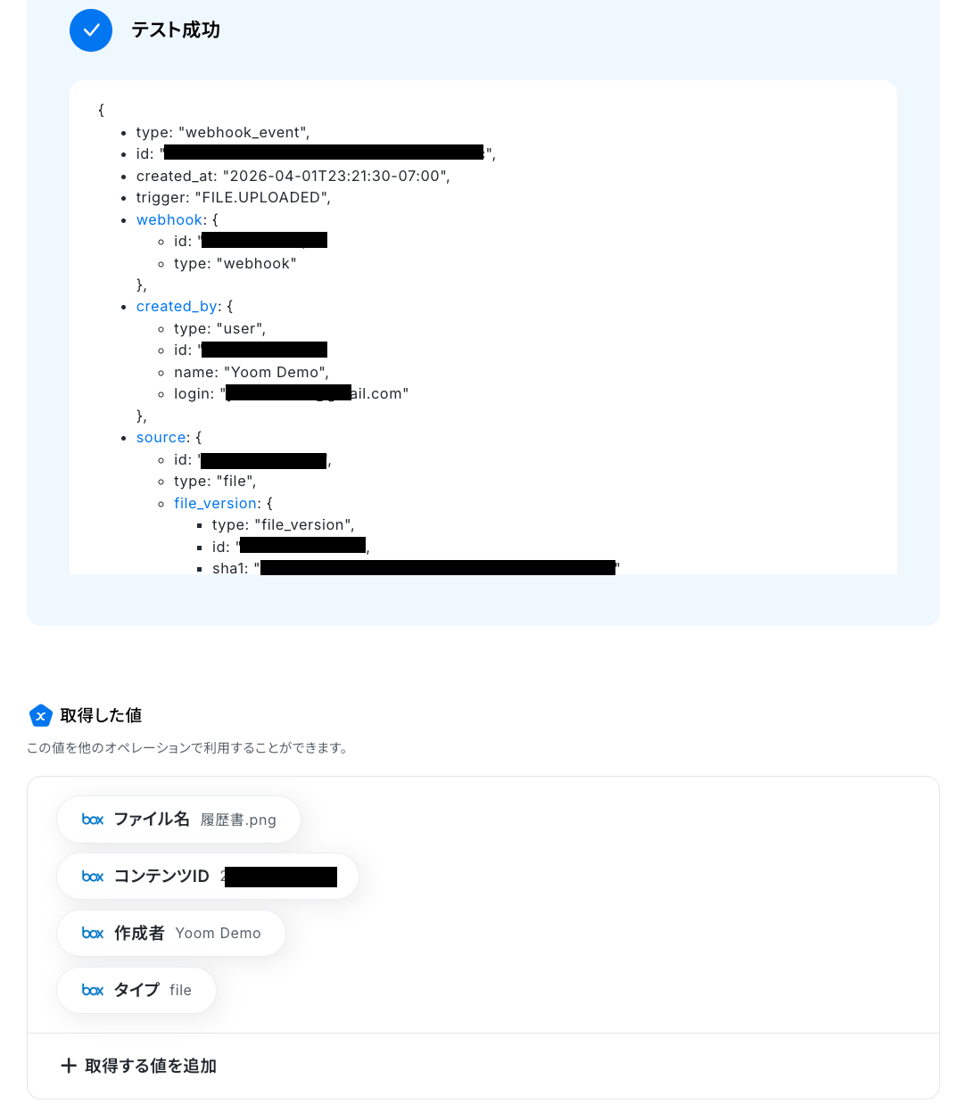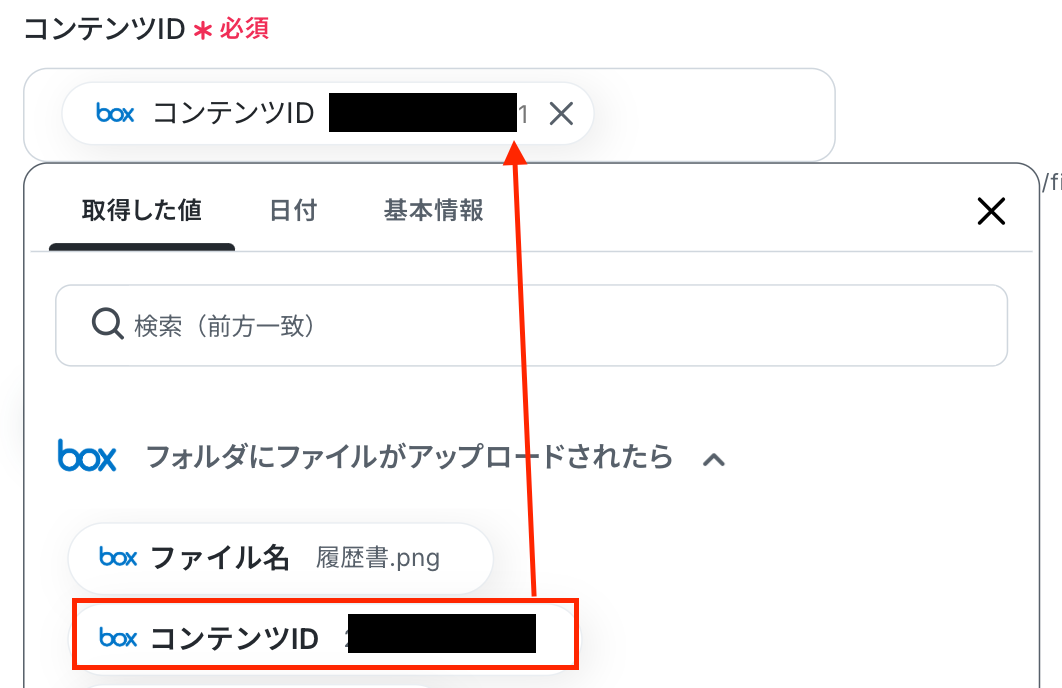 次の画面で、「コンテンツID」 を設定します。 ここでは、Boxのトリガー設定で取得した値を選択し、テストボタンをクリックしましょう。※「←トリガーで取得した値を引用してください」は削除してください。