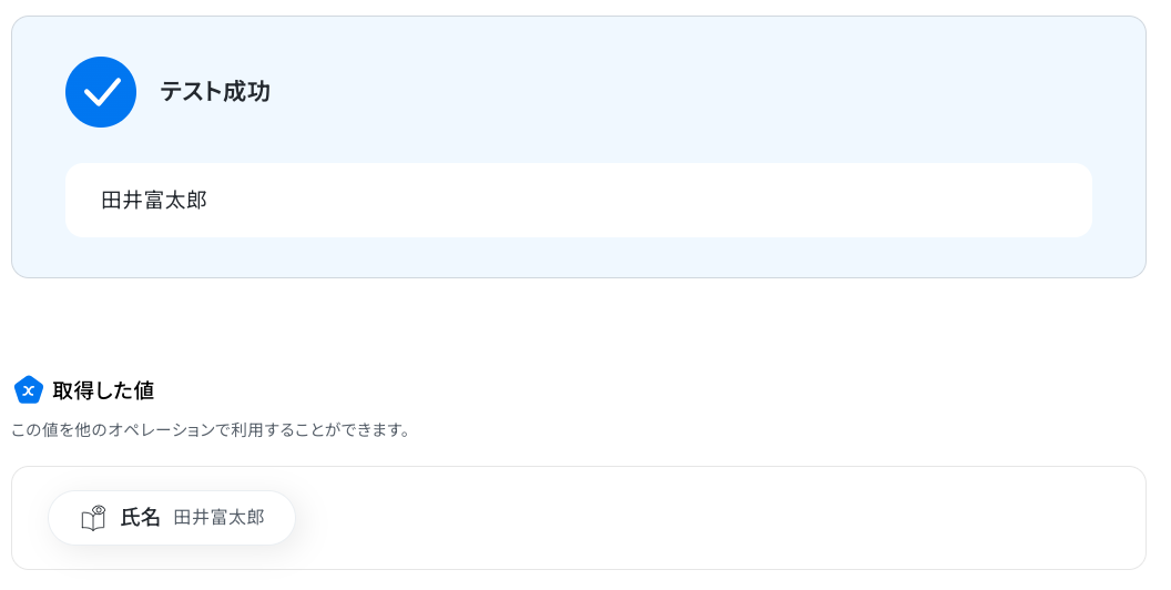 テストに成功すると、取得した値が表示されます。 確認ができたら、「完了」をクリックしましょう!