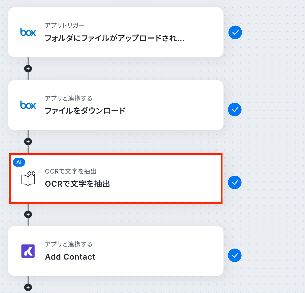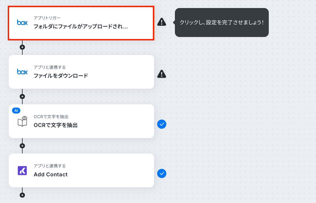 フローの作成方法 今回はBoxに履歴書が追加されたらOCRして、KommoにContactを追加する フローを作成していきます!