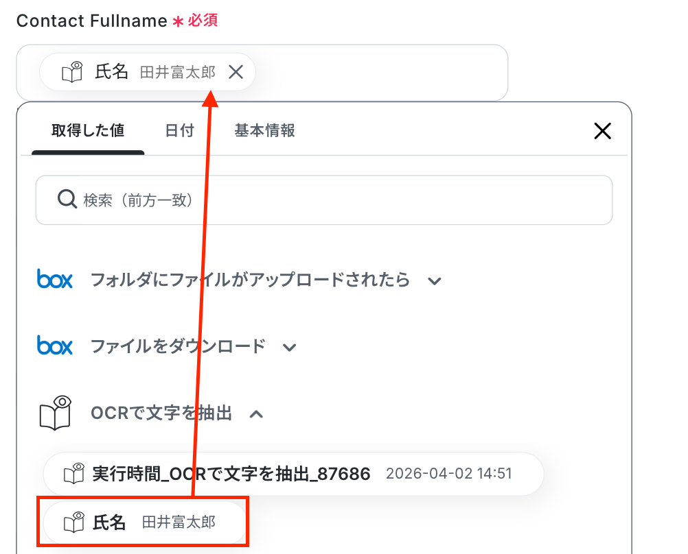 「Contact Fullname」 は、OCRオペレーションで取得した値を選択します。※『←「OCRで文字を抽出」で取得した値を引用してください』は削除してください。