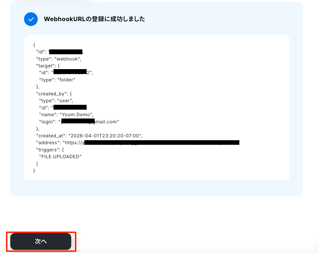 成功の表示を確認後、「次へ」をクリックしましょう!
