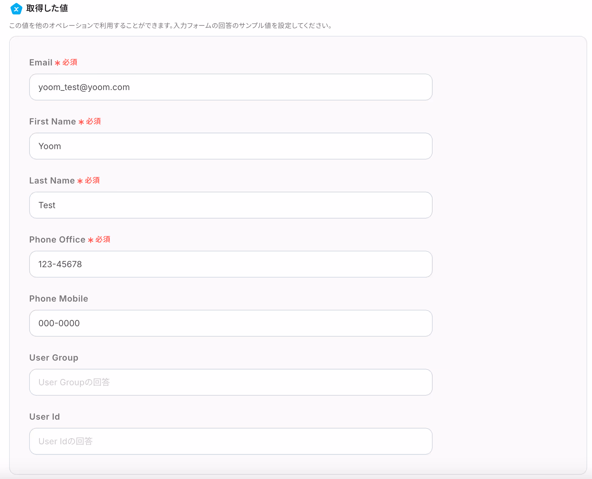 「取得した値」の欄に、今回登録する顧客情報を入力していきます。