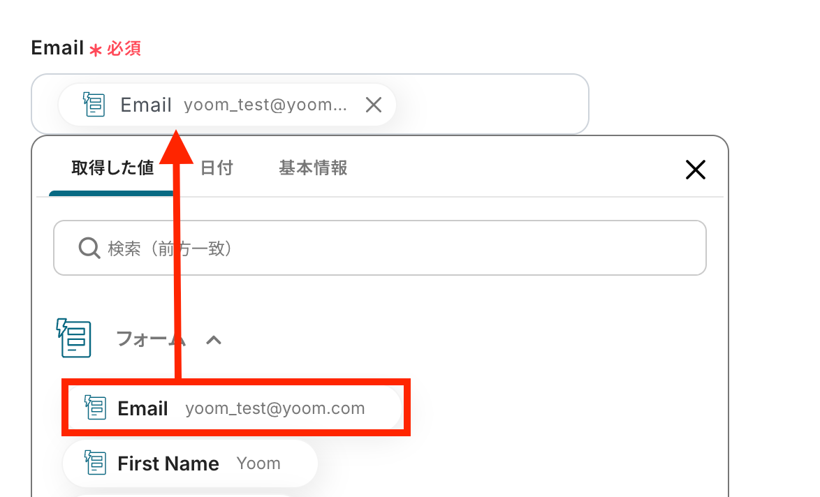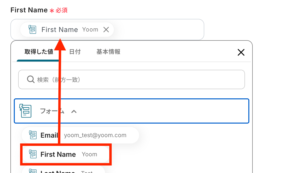 First Nameを設定します。 取得した値から選択しましょう!