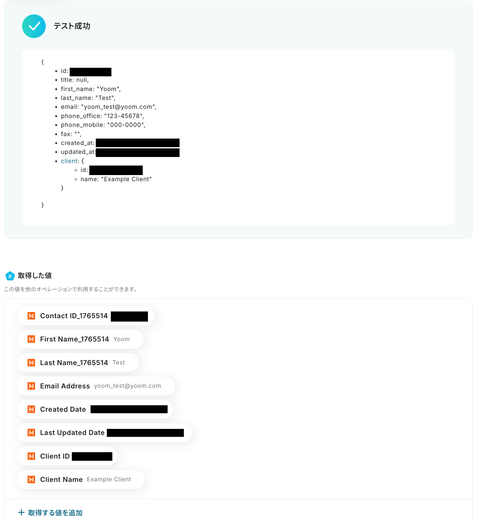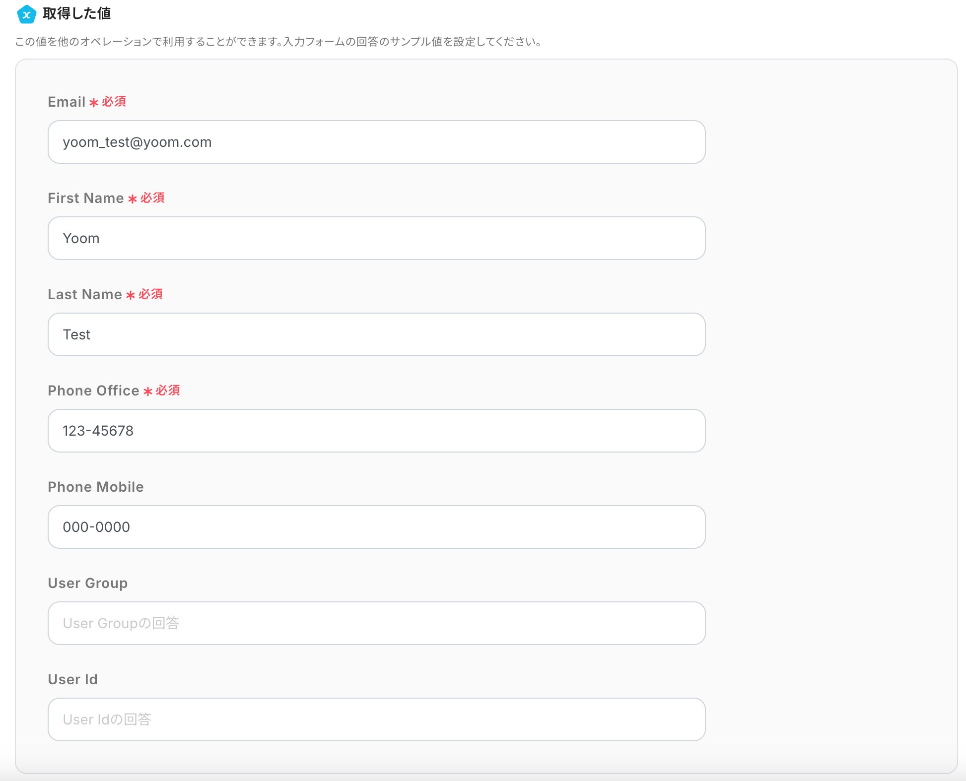 「取得した値」の欄に、今回登録する顧客情報を入力していきます。 (取得した値に入力したデータは、以降の設定でテストを行う際に各アプリに追加されます)