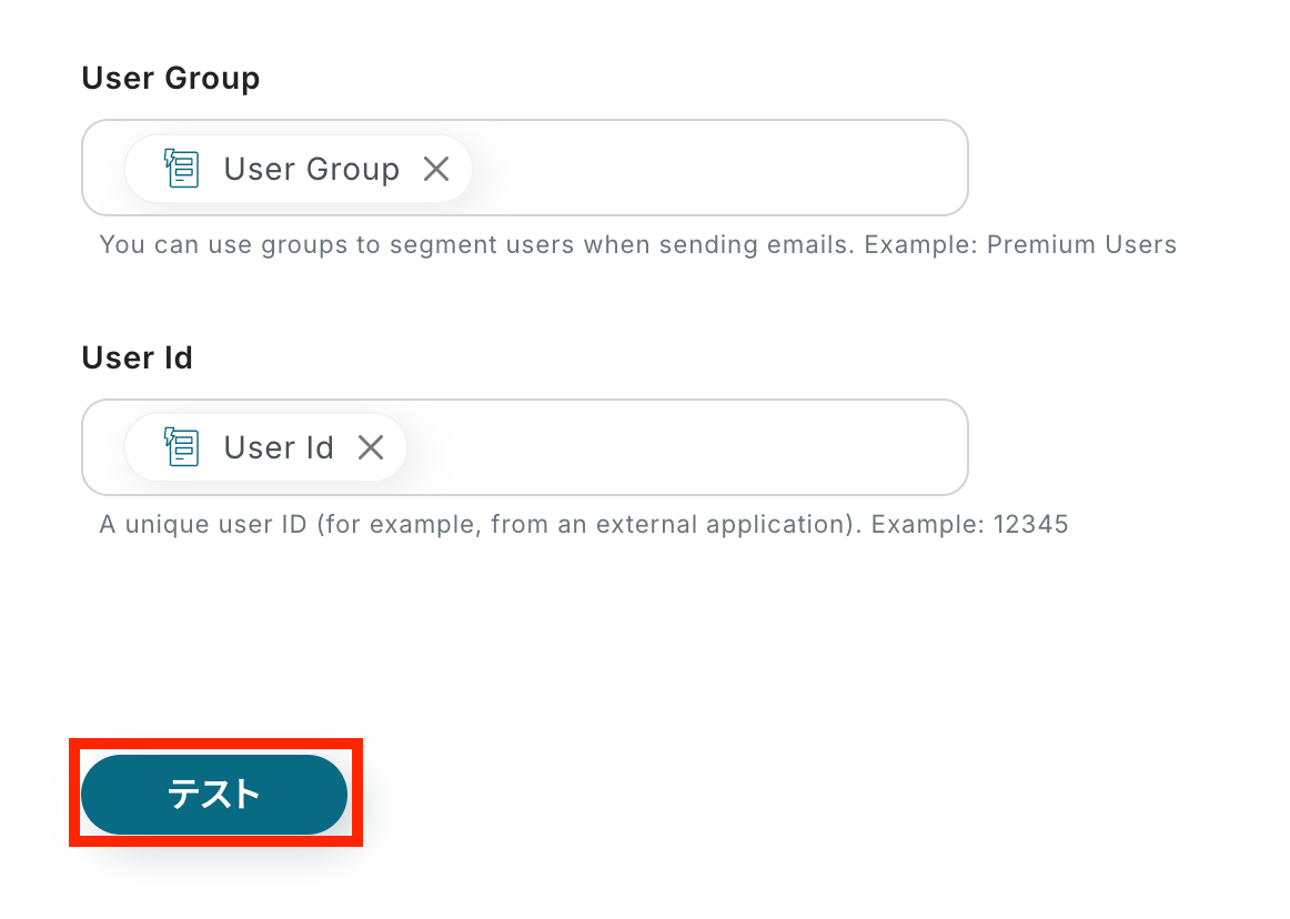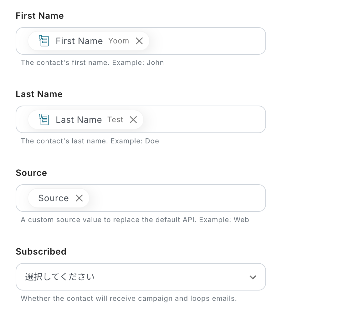 顧客情報を設定します。 下記のように、Emailはフォームで設定した値を活用しましょう。 このように取得した値を設定することで、回答が送信されるたびに、その内容をLoopsへ反映できます。 直接入力した内容は、固定値となるのでご注意ください。
