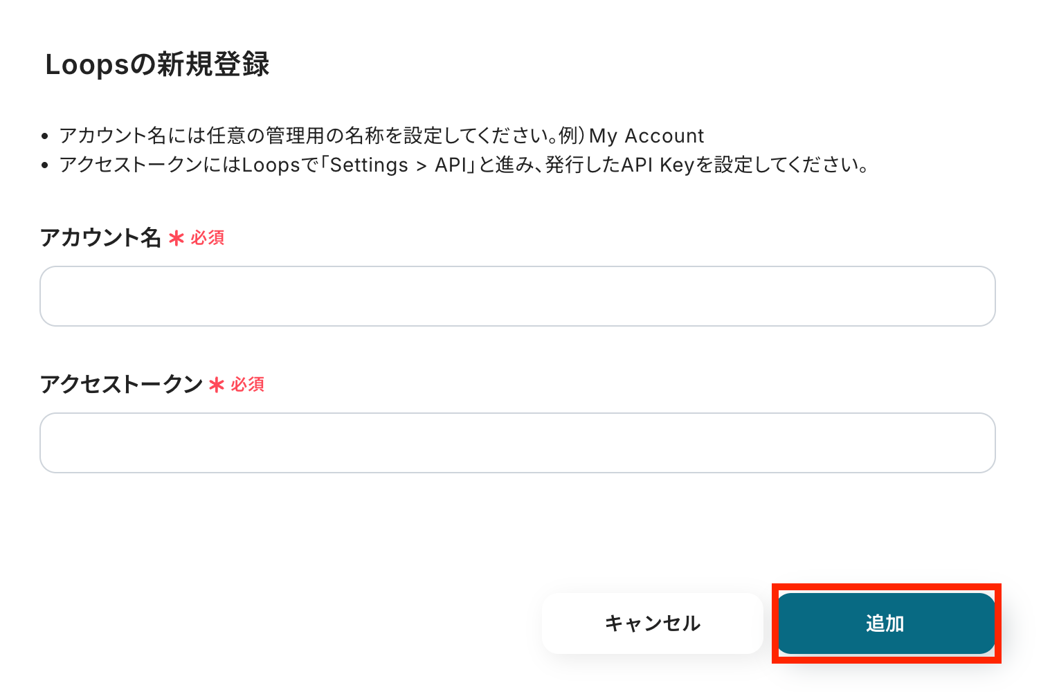 Loopsの新規登録に進みます。 アカウント名を任意の名称で設定して、Loops上でアクセストークンを取得します。 どちらの入力もできたら「追加」ボタンを押しましょう!