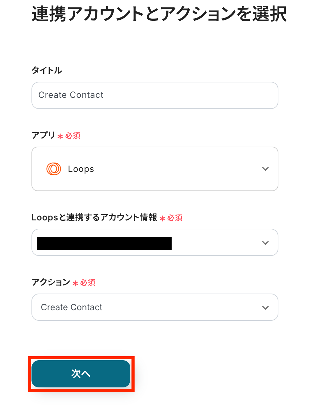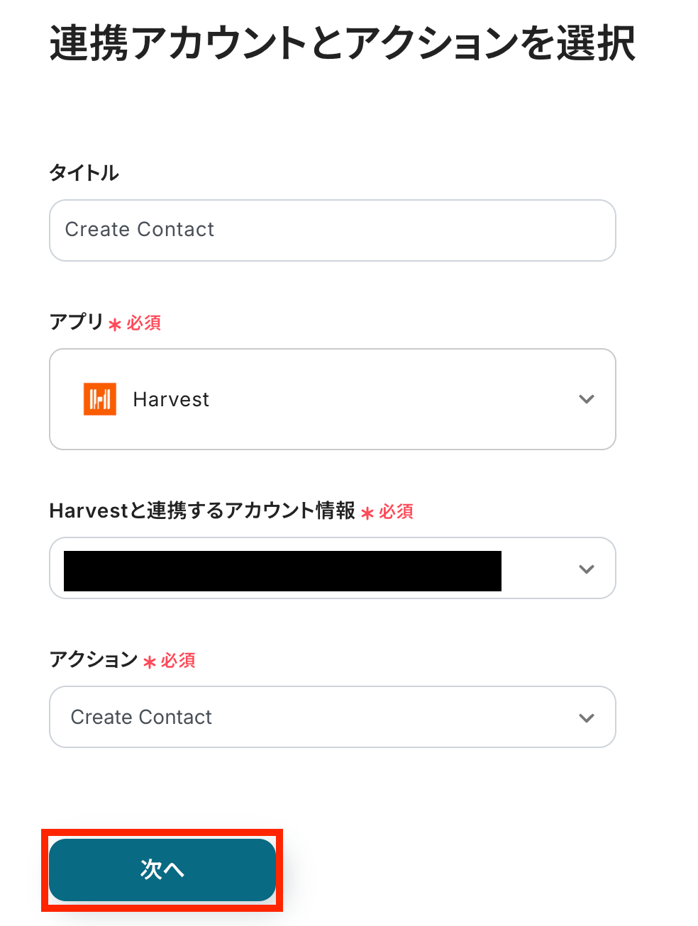 連携アカウントとアクションを選択しましょう。 アクションは、テンプレート通りに「Create Contact」のままで大丈夫です。 「次へ」をクリックして進んでください。