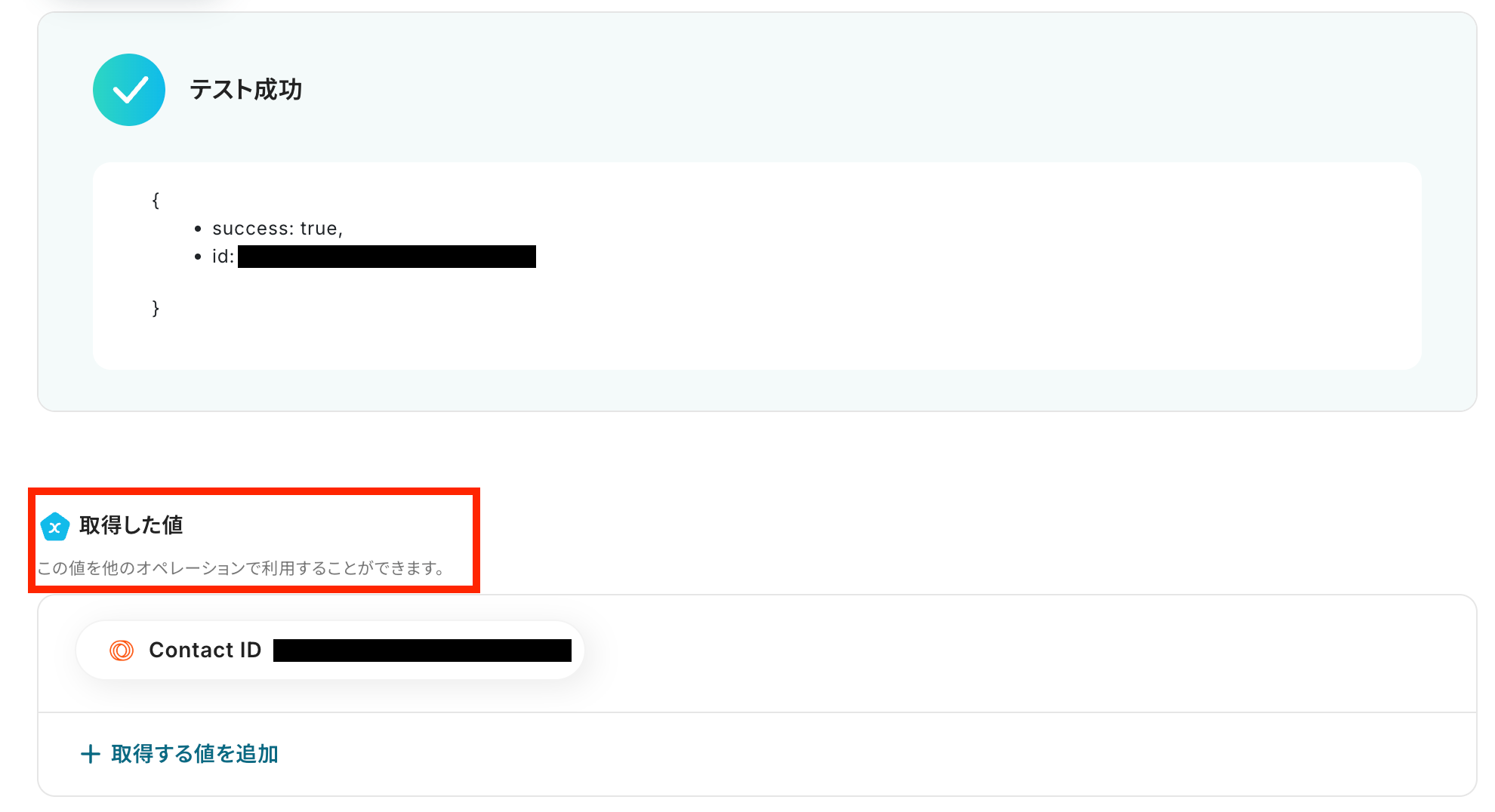 テストに成功すると、取得した値にContact IDが反映され、Loopsに新規Contactが登録されます。
