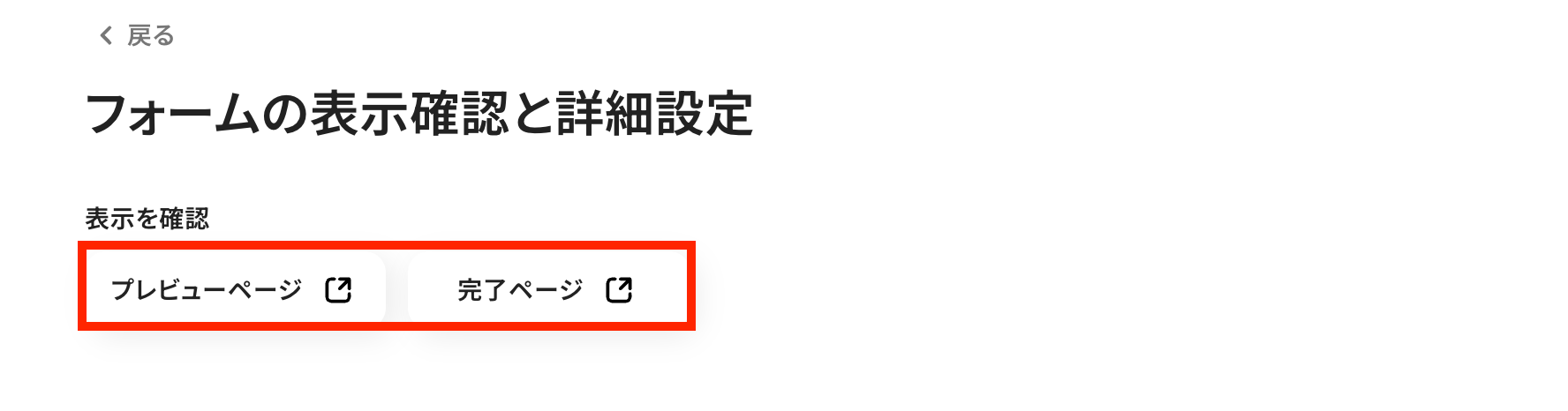 次に、フォームの表示確認と詳細設定を行います。 下記のボタンで、実際のフォームのプレビューや完了ページを見ることができます。