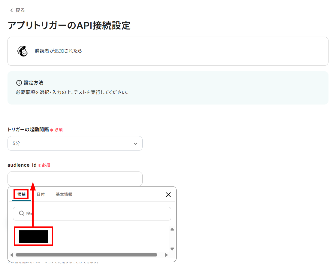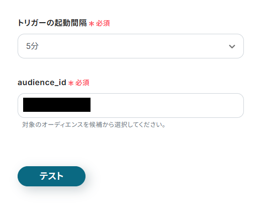 トリガーの起動間隔をプルダウンから設定し、audience_idを候補から選択してください。ここで設定した時間間隔ごとに、Mailchimpで購読者が追加されたかを確認します。