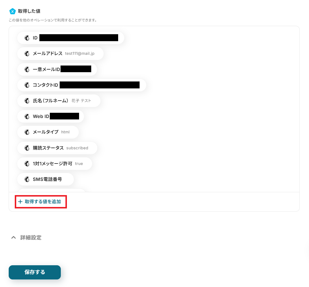 テストが成功すると、取得した値に購読者の情報が表示されるので、確認して保存します。