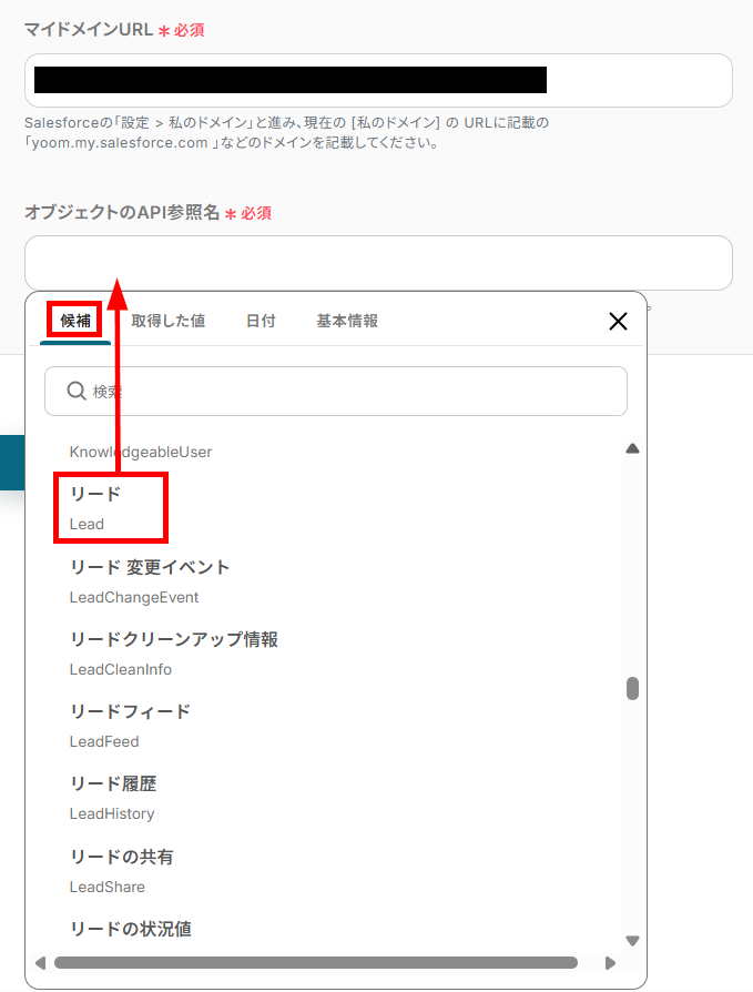 オブジェクトのAPI参照名は、マイドメインURLを入力すると、候補から選択できます。今回は、リードを登録するため、リードオブジェクトを選択しました。