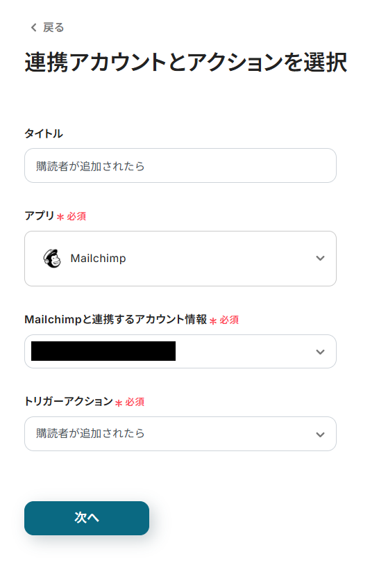 - ここでの設定により、Mailchimpに購読者が追加されると、フローボットが起動します。