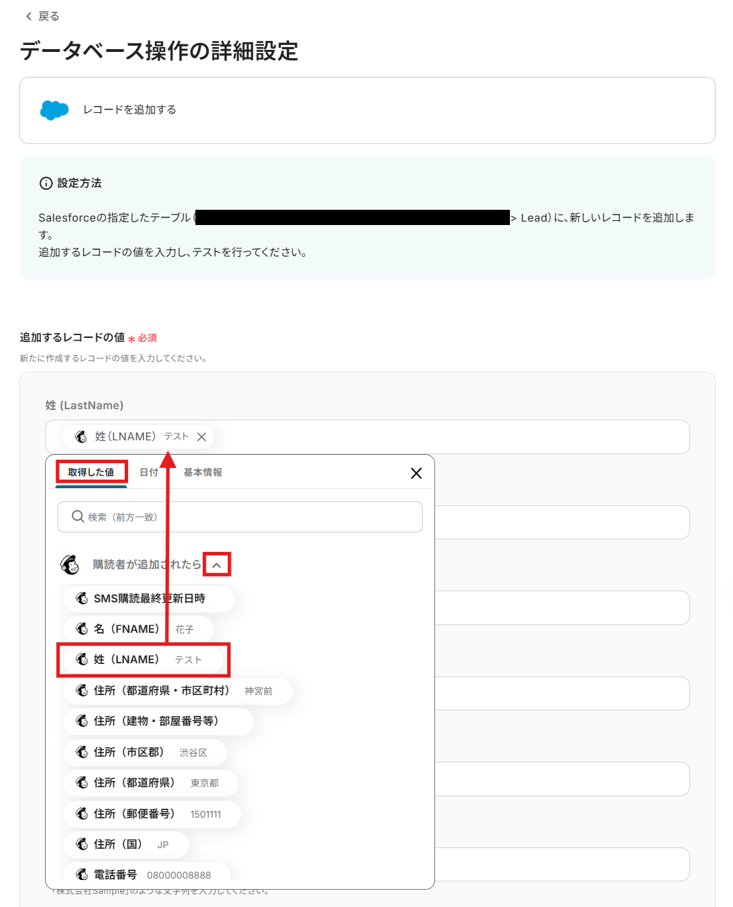 Salesforceにレコードを追加するステップで、「追加するレコードの値」にカスタム項目が表示されます。