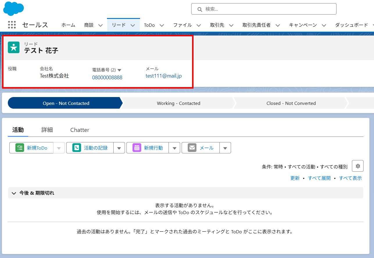 テストが成功すると、Salesforceにレコードが追加されるので確認してください。
