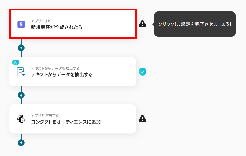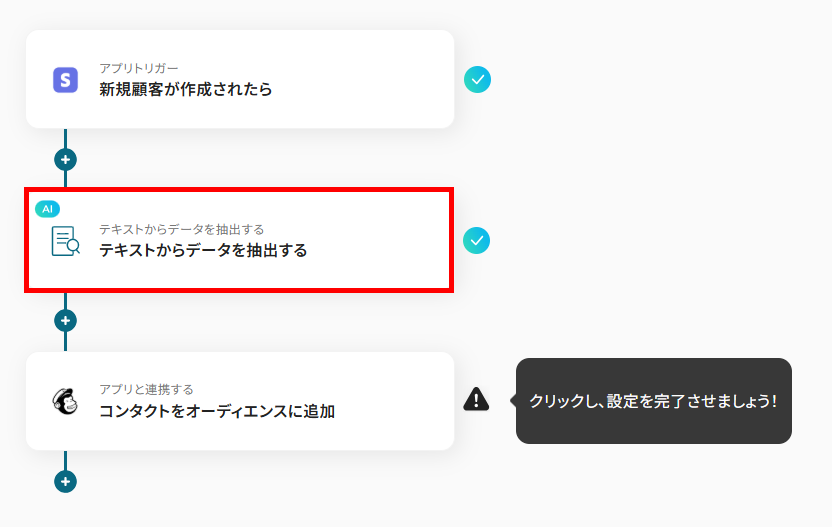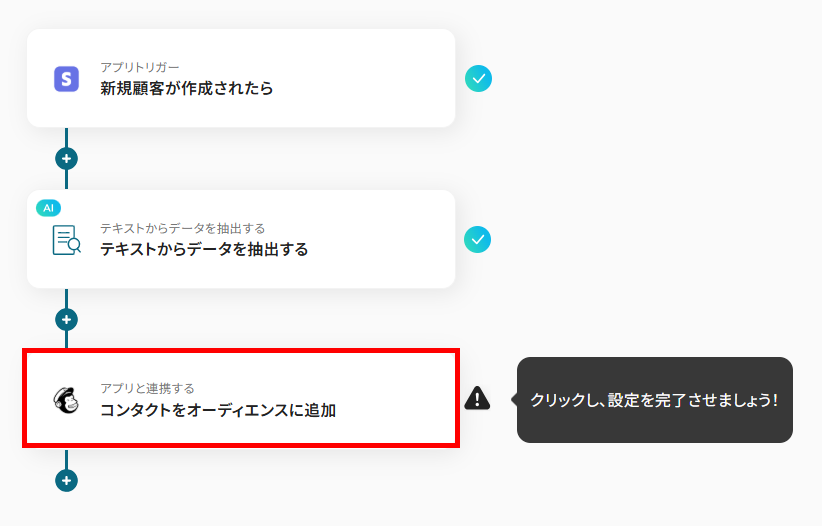 その後、解説したテンプレートと同様にテキストを抽出する設定とMailchimpにコンタクトを追加する設定を行ってください。