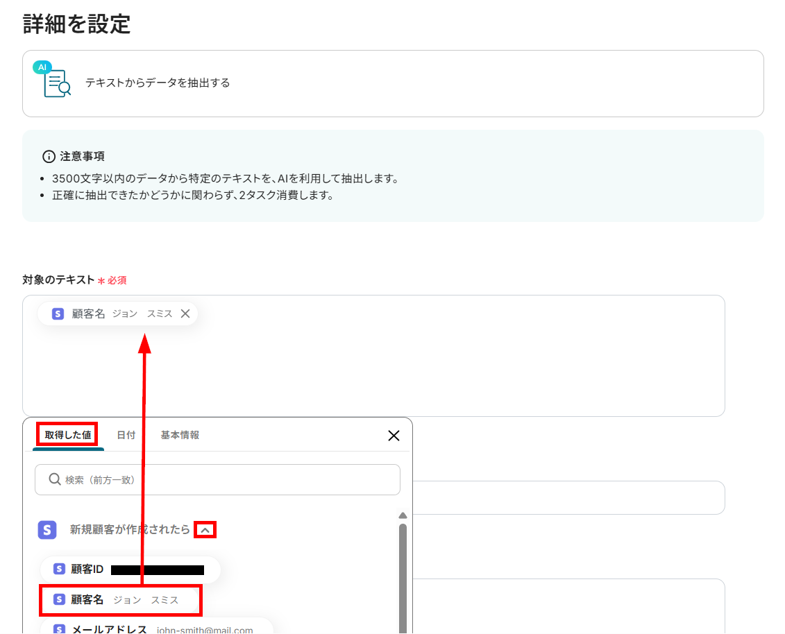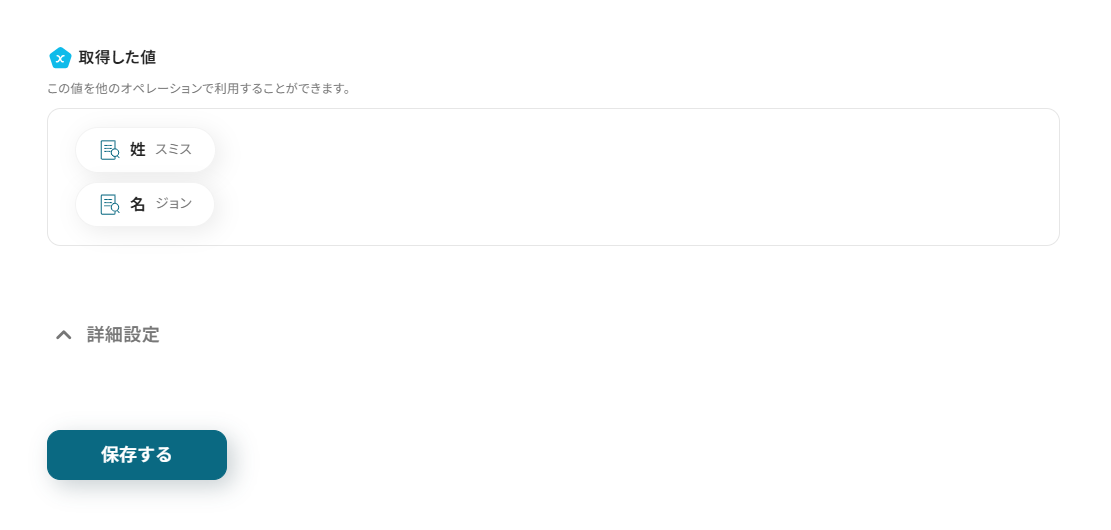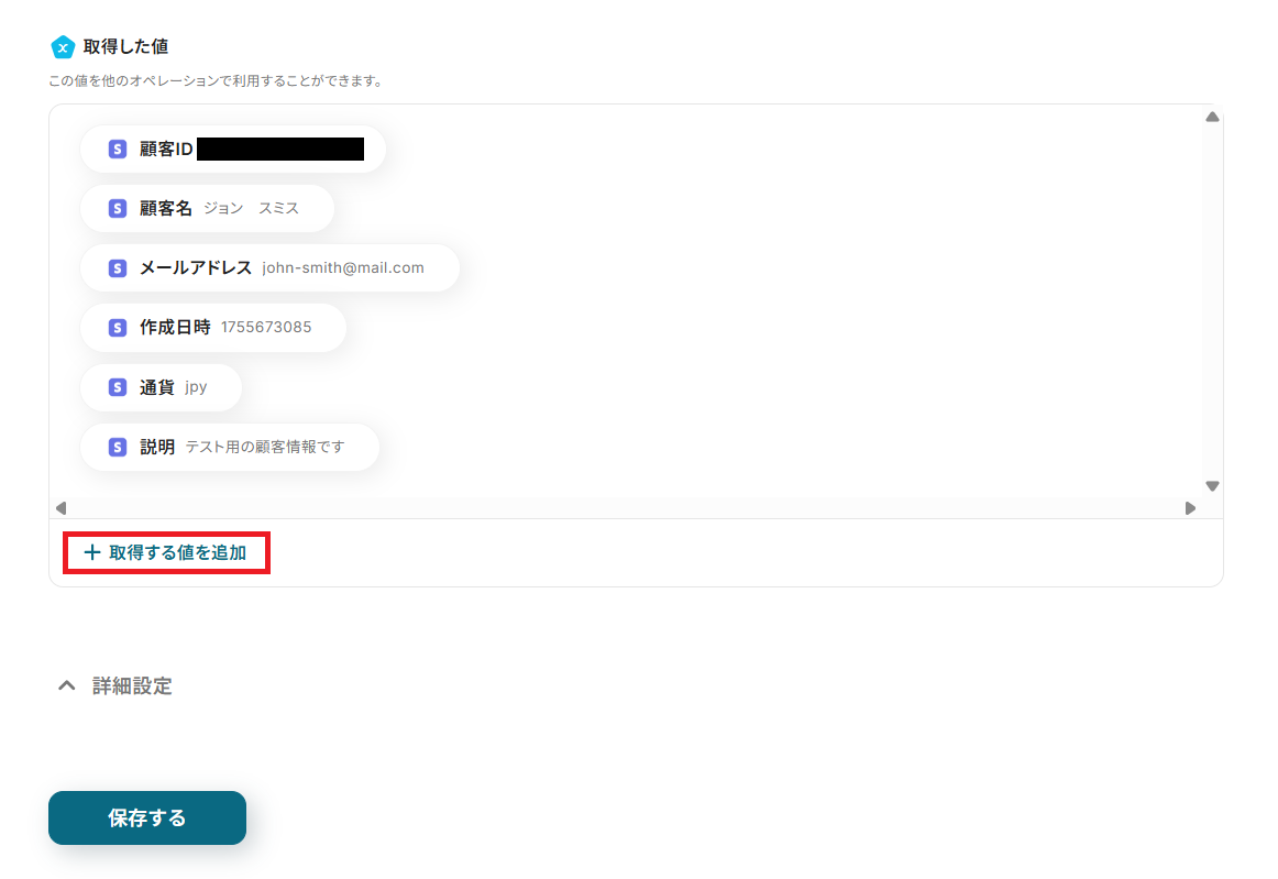 テストが成功すると、取得した値に顧客の情報が表示されるので、確認して保存します。