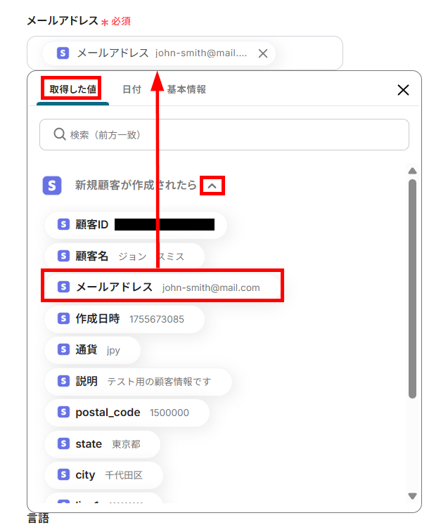 メールアドレスなどの項目に、ここまでの設定で取得した値を利用する場合は、以下のように設定しましょう。