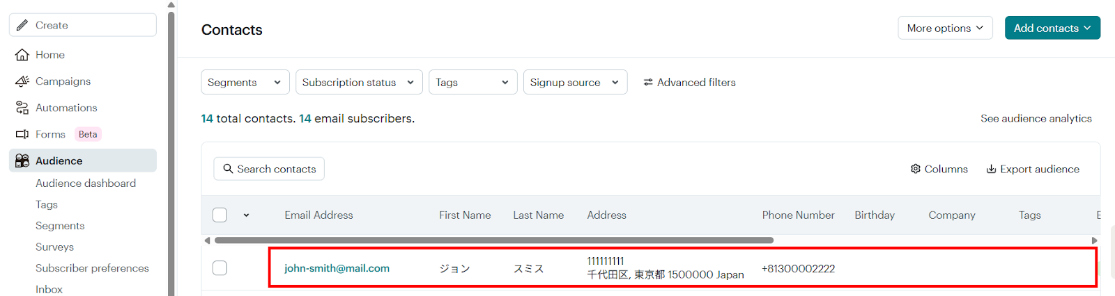 テストが成功すると、Mailchimpにコンタクトが追加されるので確認してください。