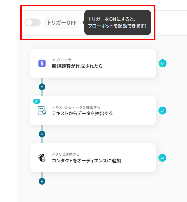 フローボットを今すぐ起動する場合は、「トリガーをON」をクリックしてください。