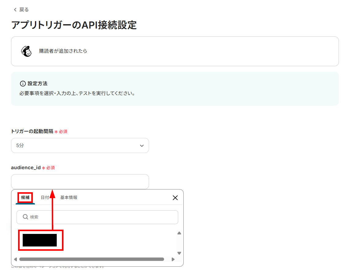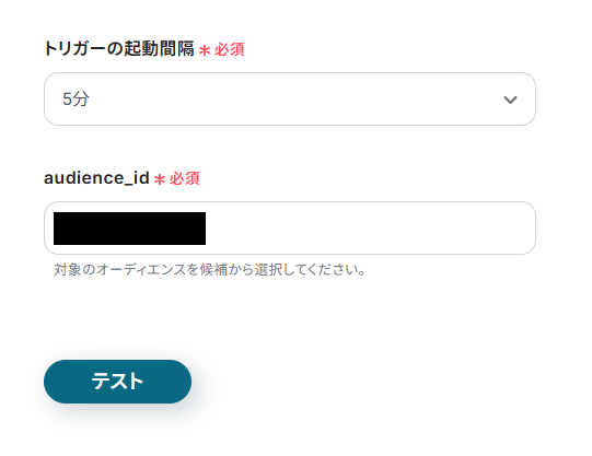 トリガーの起動間隔をプルダウンから設定し、audience_idを候補から選択してください。