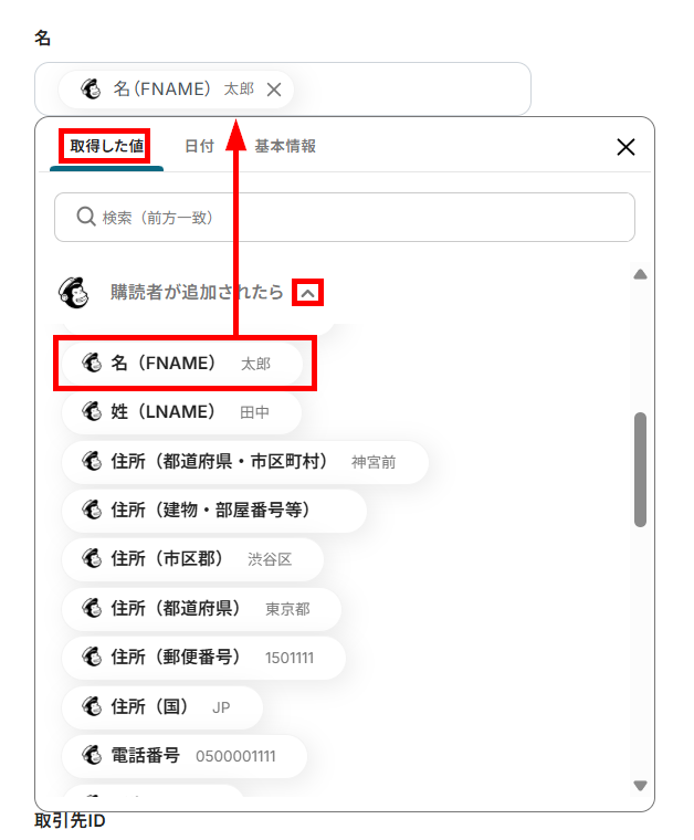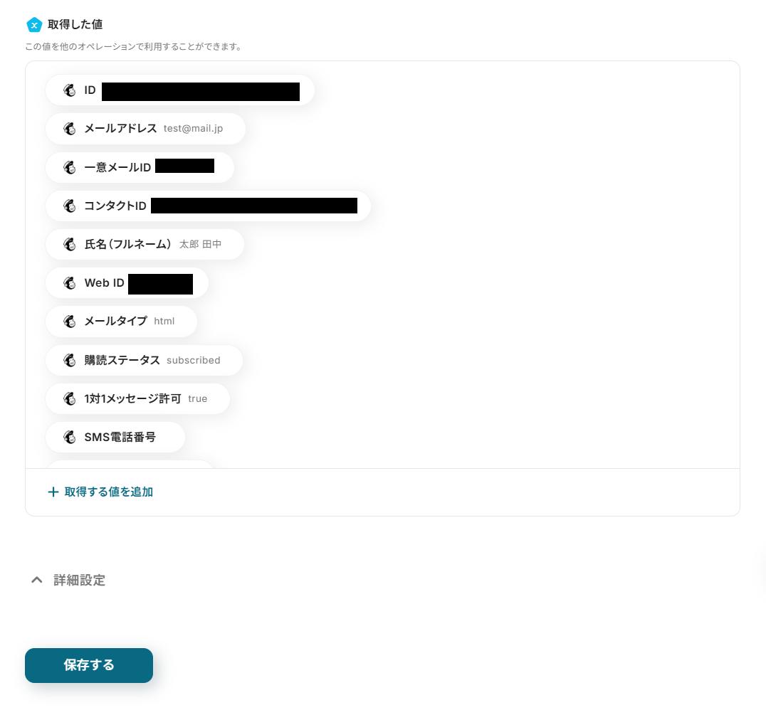 Mailchimpから取得した値を登録する項目は、以下の画像のように設定します。