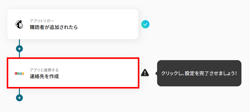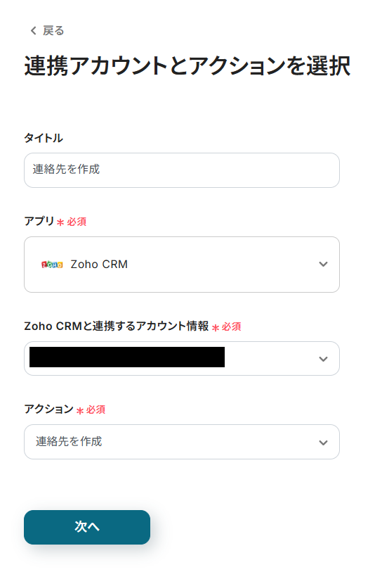 続いて、Mailchimpから取得した値を利用して、Zoho CRMに連絡先を作成する設定を行います。